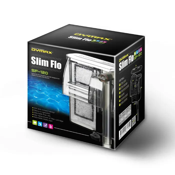 DYMAX Slim Flo SF-120 is a slim, external hang‑on filter designed to give you effective mechanical and biological filtration without taking up valuable space inside the aquarium. Instead of sitting in the tank like a conventional internal power filter, DYMAX Slim Flo SF-120 hangs neatly on the rim of the glass, keeping the interior clean and open for fish, shrimp and aquascaping.