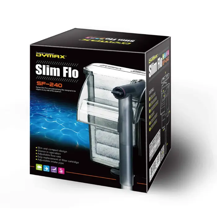 DYMAX Slim Flo SF-240 is a compact external hang‑on filter designed to give medium‑sized aquariums strong, efficient filtration while keeping the inside of the tank free for fish, shrimp and aquascaping. Instead of sitting in the water like an internal power filter, DYMAX Slim Flo SF-240 hangs neatly on the rim of the glass, helping maintain a clean, uncluttered display.