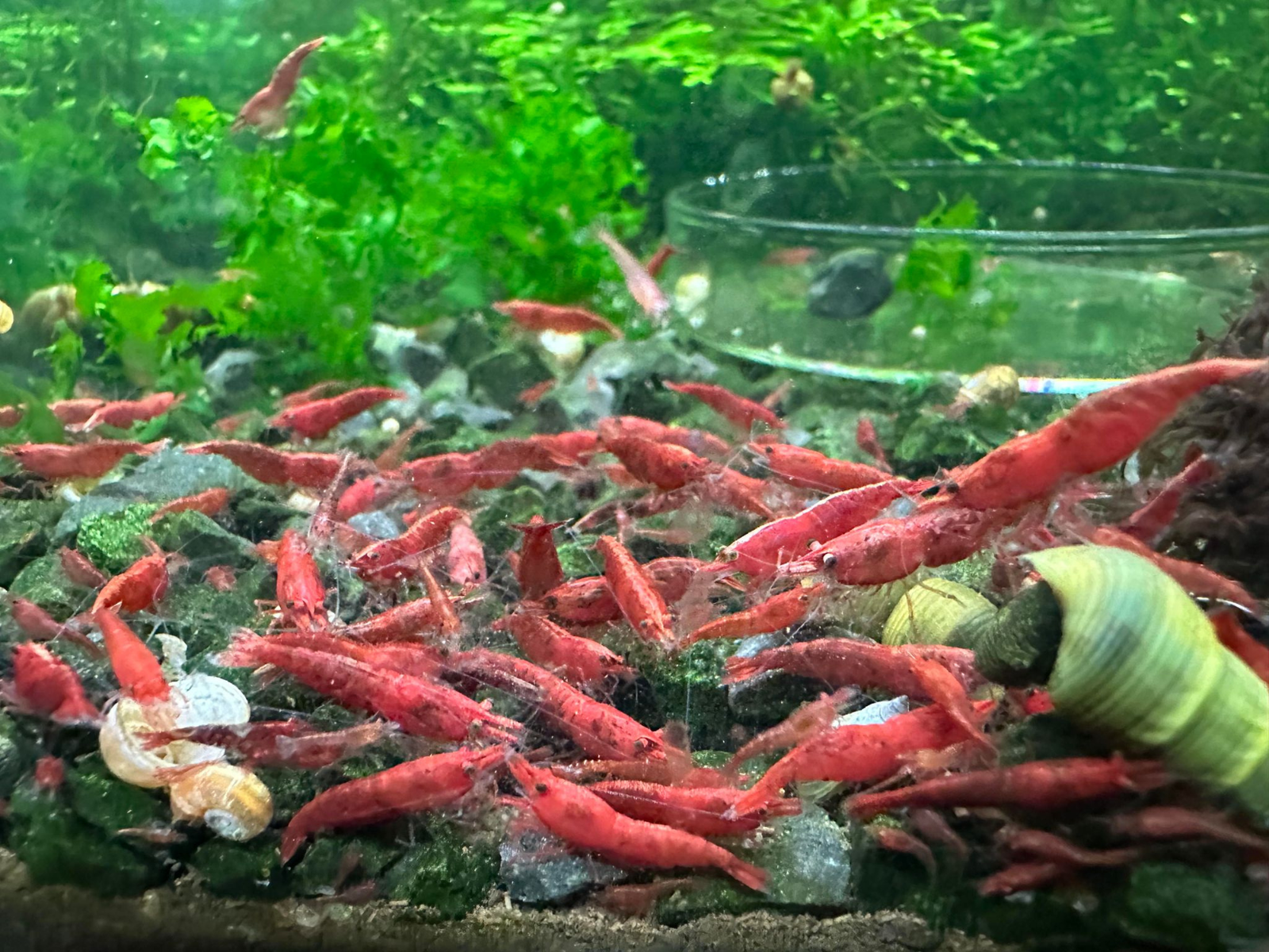 In a well‑planted aquarium with hiding spots and stable water, Fire Red Cherry Shrimp will be active throughout the day and display their best colour.