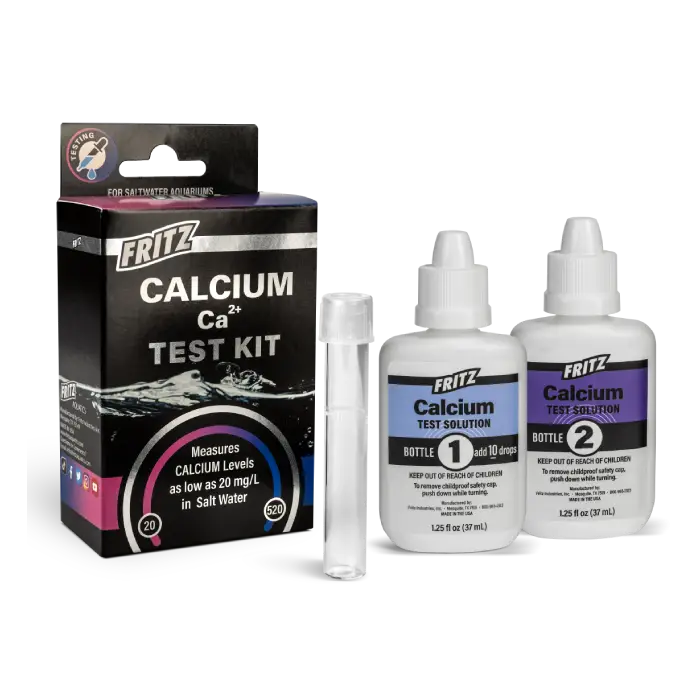 - Holding the bottle vertically, Add Calcium Test Solution #2 drop by drop into the test tube , shaking gently between and counting drops. Stop when the solution changes from pink to blue. As the blue endpoint is approached, color will change from pink to purple before changing to blue. After purple color forms, only 1-2 more drops should be required to reach the blue endpoint. Calcium level is # of drops x 20. Use chart to determine calcium level.