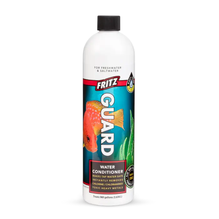 FritzGuard Water Conditioner 473ml removes chlorine and chloramine, detoxifies heavy metals, and adds protective slime coat. Safe for all aquariums!