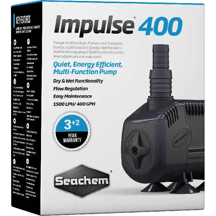 Seachem Impulse 400—quiet, energy-efficient aquarium pump. Reliable water flow for filtration, circulation, or fountains in freshwater and marine tanks!