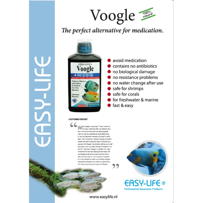 By using carefully selected plant extracts and vitamins, Easy-Life Voogle 1L helps fish recover from infections, wounds and stress while remaining safe for shrimp, plants and the biological filter. This makes it an excellent choice for regular preventative use as well as during times of stress, transport or after introducing new fish.